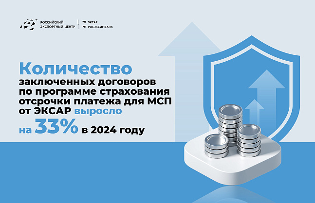 В 2024 году количество заключенных договоров по программе ЭКСАР (входит в группу РЭЦ) «Страхование отсрочки платежа для МСП» выросло на 33%, превысив 300 заключенных договоров.